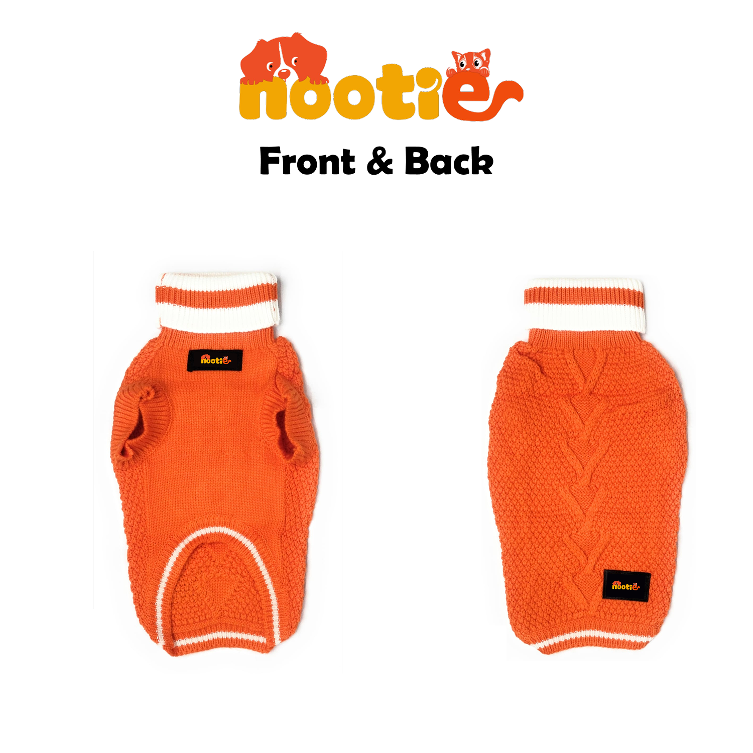 Nootie Dog High Neck Sweater, Orange – Soft, Warm & Lightweight Comfort. Made from premium, ultra-soft knit material, this sweater offers gentle warmth and a breathable fit. The ribbed high neck and hem provide a secure yet flexible hold, making dressing your pet easy and hassle-free. With its timeless orange cable-knit pattern and white stripe accents, it’s a must-have for your dog’s winter wardrobe.