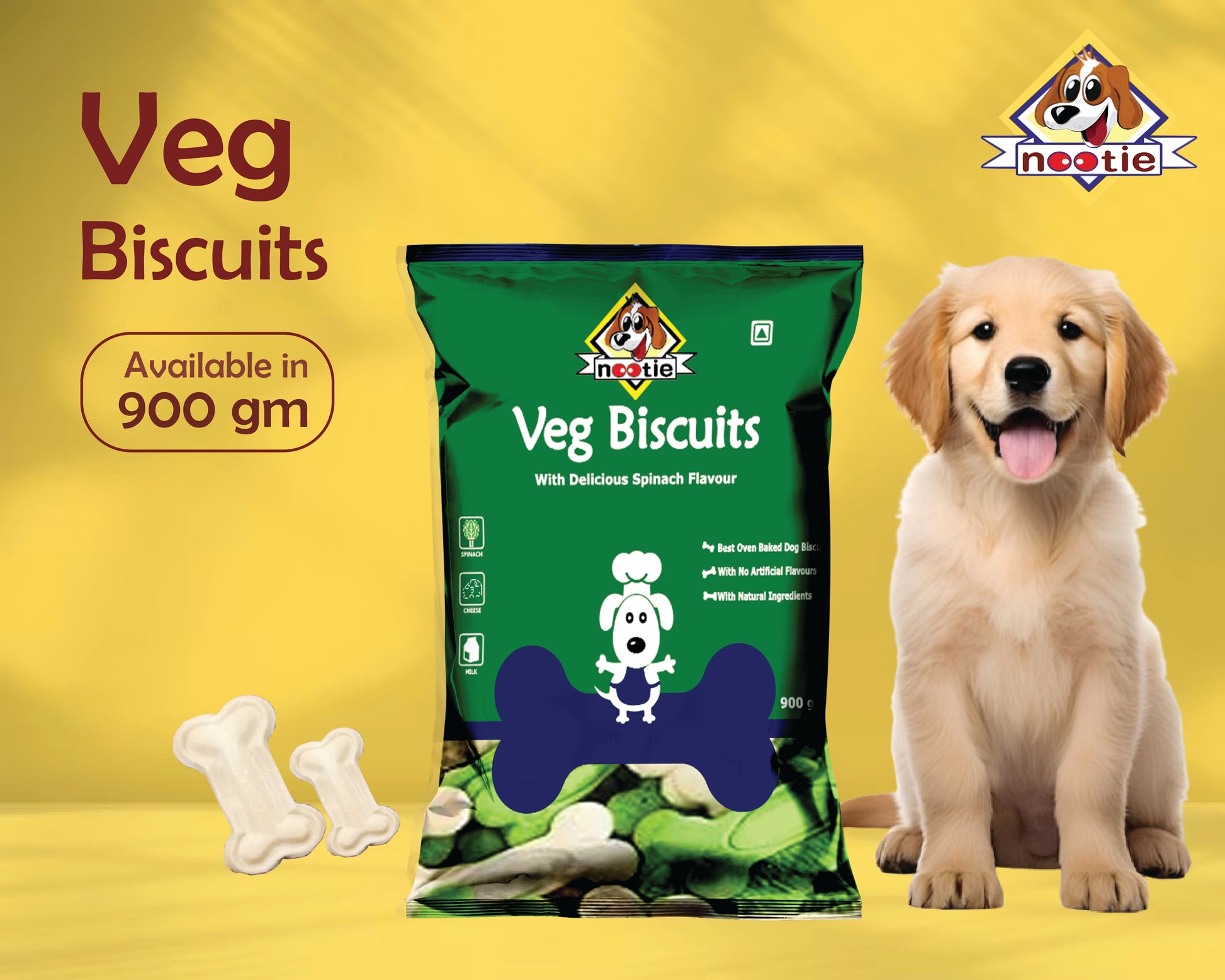 Nootie Veg Biscuits with Spinach Flavour for Adult Dogs - 900 Gms - Available in mouthwatering options like Chicken, Peanut Butter - Made with high-quality proteins to support healthy muscle maintenance and easy digestion for all breeds and life stages. - Enriched with essential vitamins and minerals to help maintain strong bones, a resilient immune system, and a shiny, healthy coat. -These flavorful, bite-sized biscuits are ideal for reinforcing good behavior or treating your dog during the day. -Made with Natural Ingredients Free from artificial flavors, colors, and preservatives—offering a wholesome treat you can feel confident giving your dog.