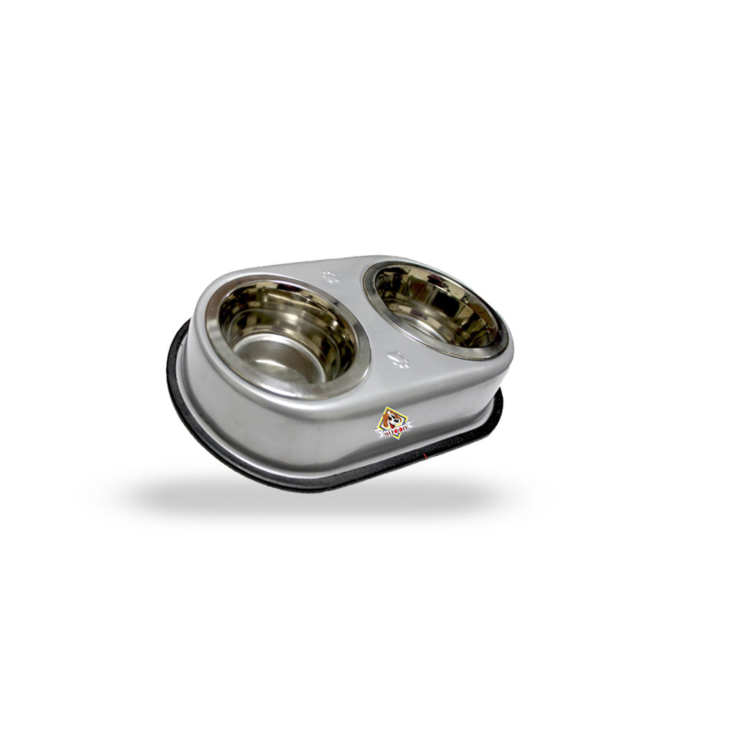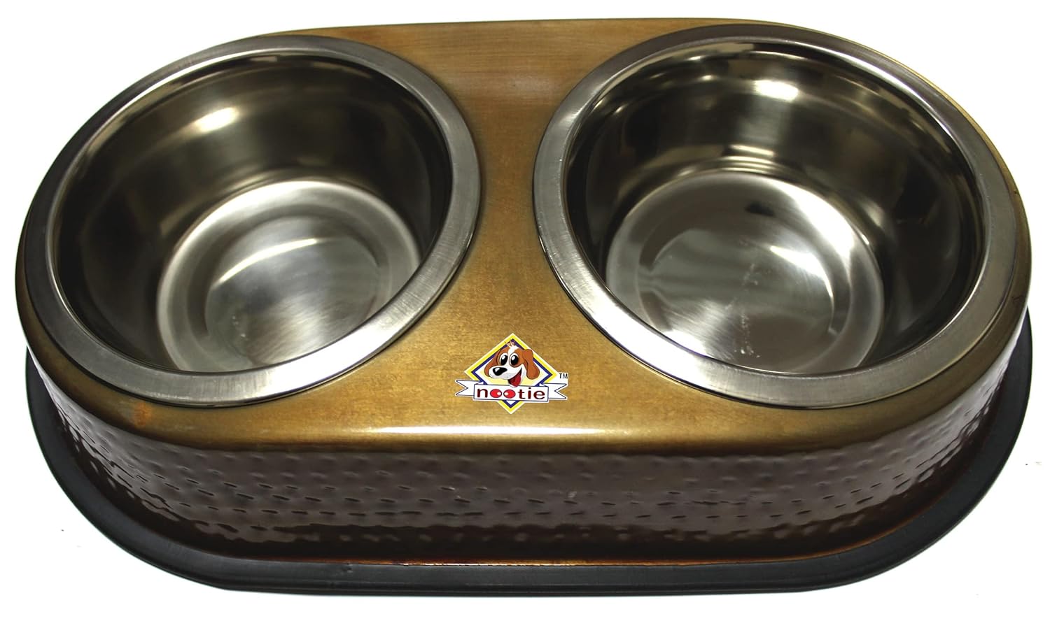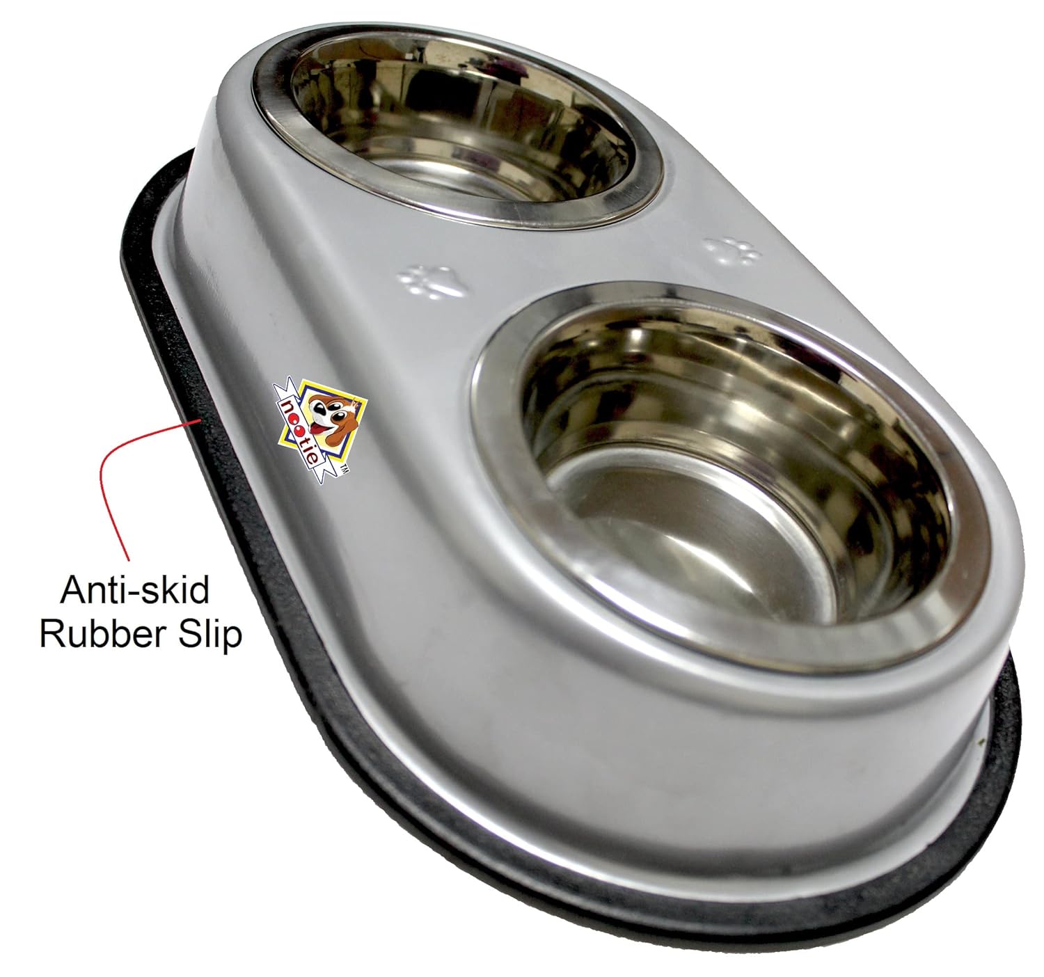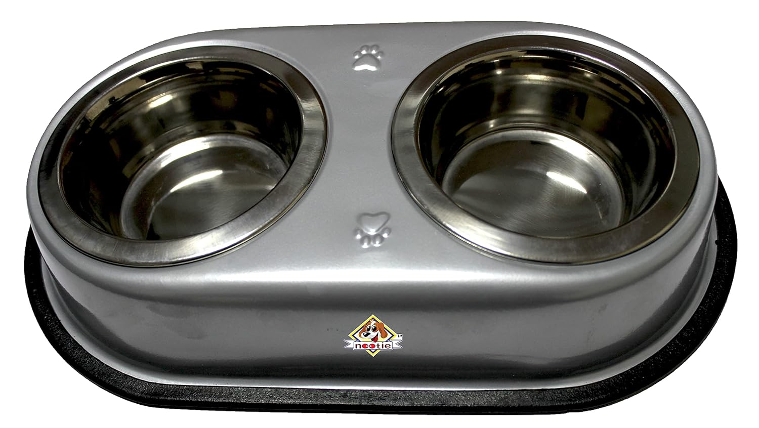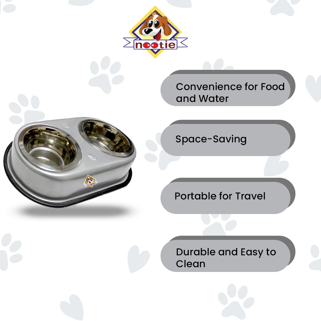 NOOTIE DOUBLE SIDE BOWL, SIZE- MEDIUM Features: -Rust-resistant, durable, and built to last Slip-Resistant Rubber Base – Prevents sliding and minimizes mealtime noise No-Tip Design – Stays stable even with enthusiastic eaters Odor-Free Material – Maintains freshness and hygiene Dishwasher-Safe – Easy to clean for your convenience Stackable Design – Space-saving for home or travel Safe for Dogs & Cats – Ideal for all breeds and sizes Sleek & Functional – Modern look with everyday practicality Create a live image with pet parent to feed his dog, dog food in one bowl and wayer in second bowl and show features in the image