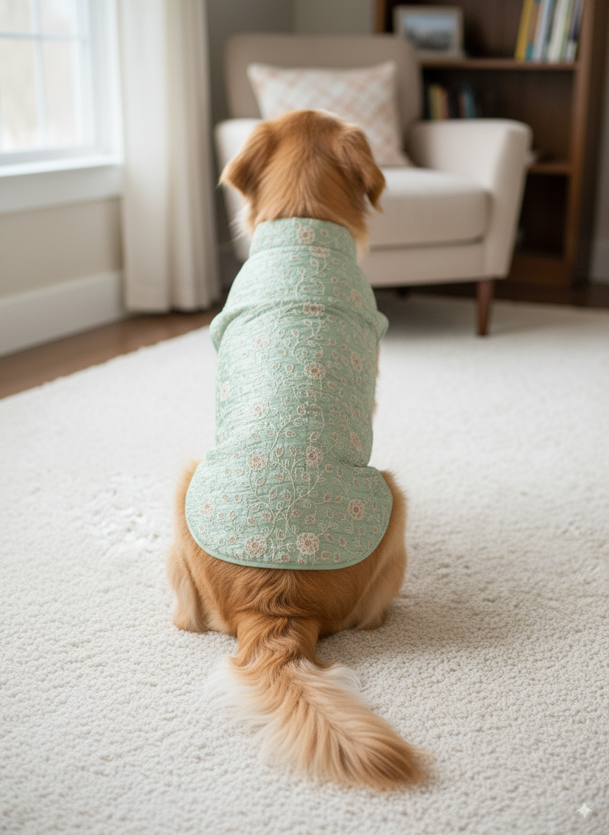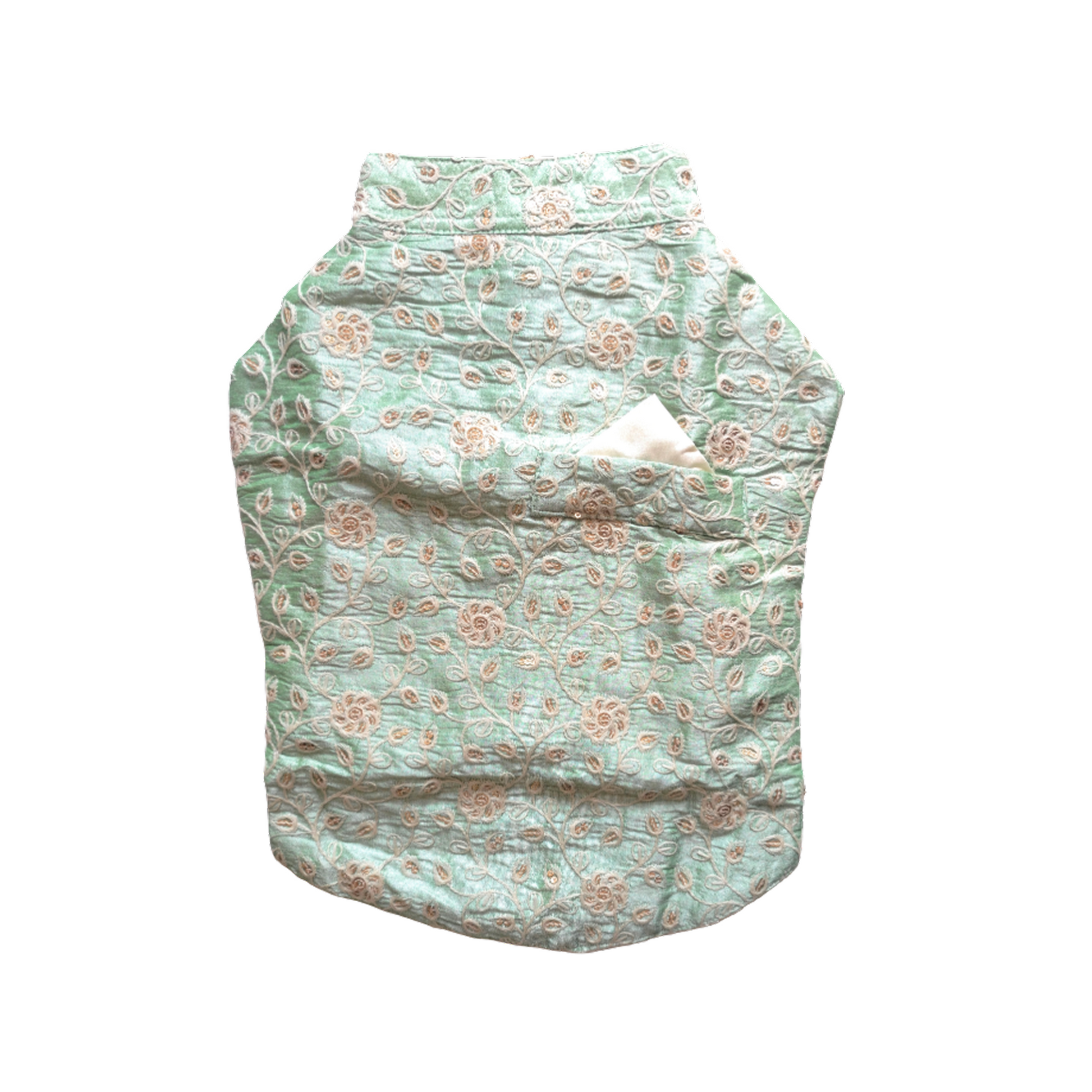 This festive sherwani blends elegance with comfort, making your pet look dashing without compromising on ease of movement. The parrot green shade with intricate embroidery adds a regal touch to your pet’s wardrobe.