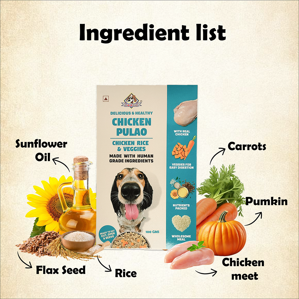 Formulation: Non-vegetarian recipe focused on protein (chicken) and palatability (peanut butter).
