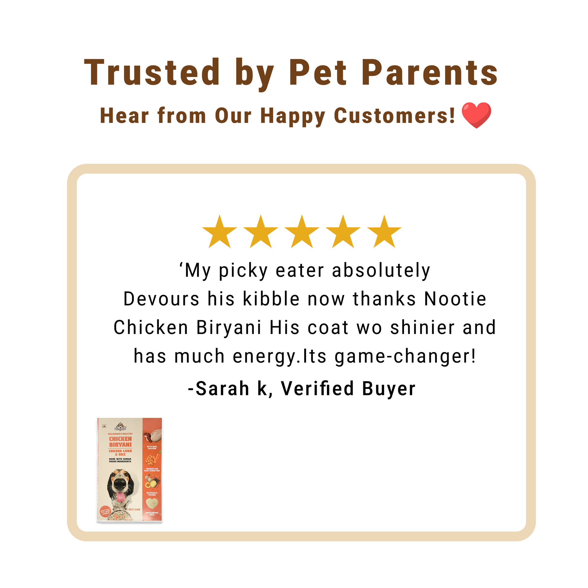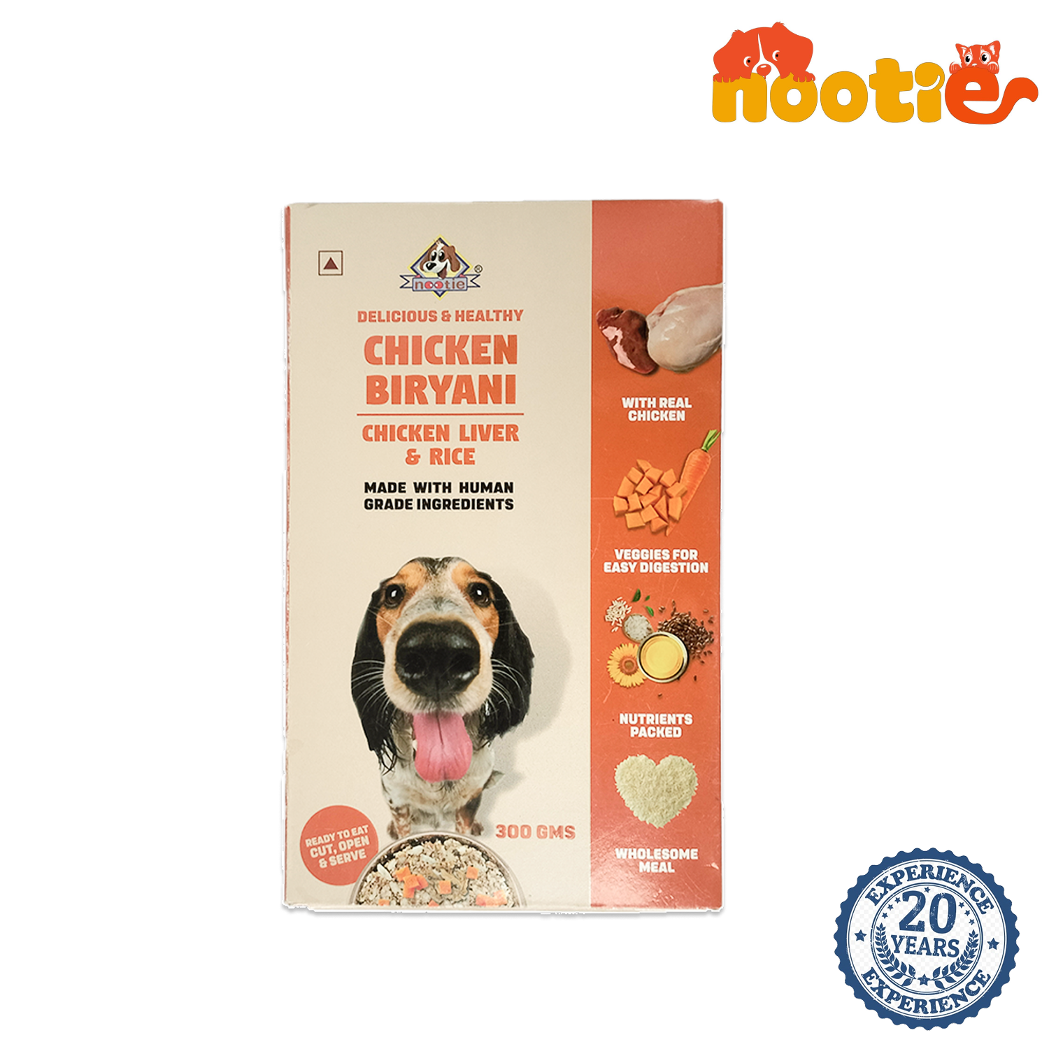 Nootie Freshly Wholesome Chicken Biryani | Chicken Liver & Rice Flavor -Suitable For Puppies & Adult Dogs: Balanced & Complete nutrition for adult dogs and puppies of all breeds and sizes - Human Grade Ingredient: Unlike most pet food, this recipe uses 100% human grade Ingredient. - Optimal Protein for growth & healthy living.