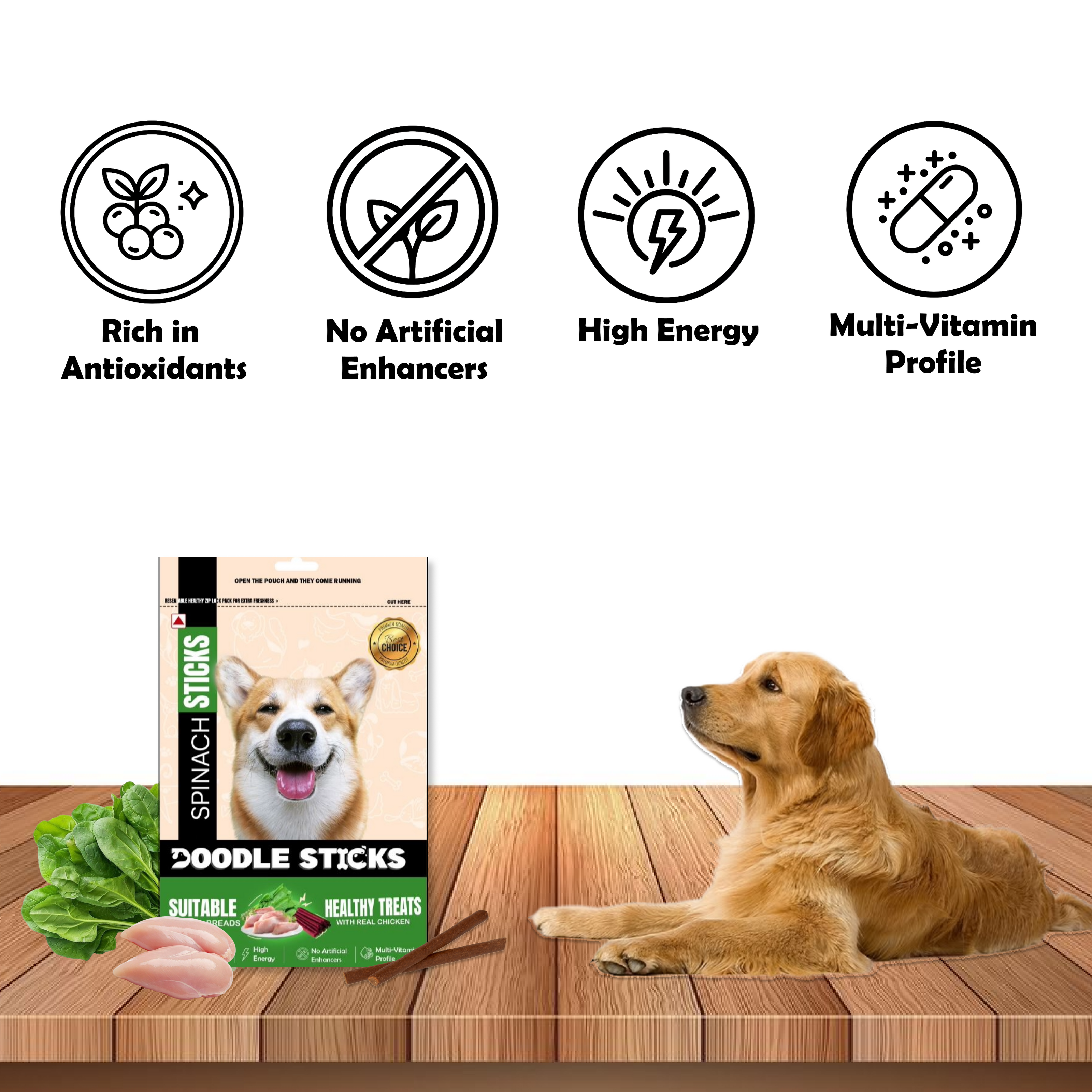 Nutritious, protein-rich sticks made with real chicken and spinach. Packed with collagen, iron, and vitamins to support joints, coat, and immunity. Gluten-free, easy to digest, and suitable for all breeds.