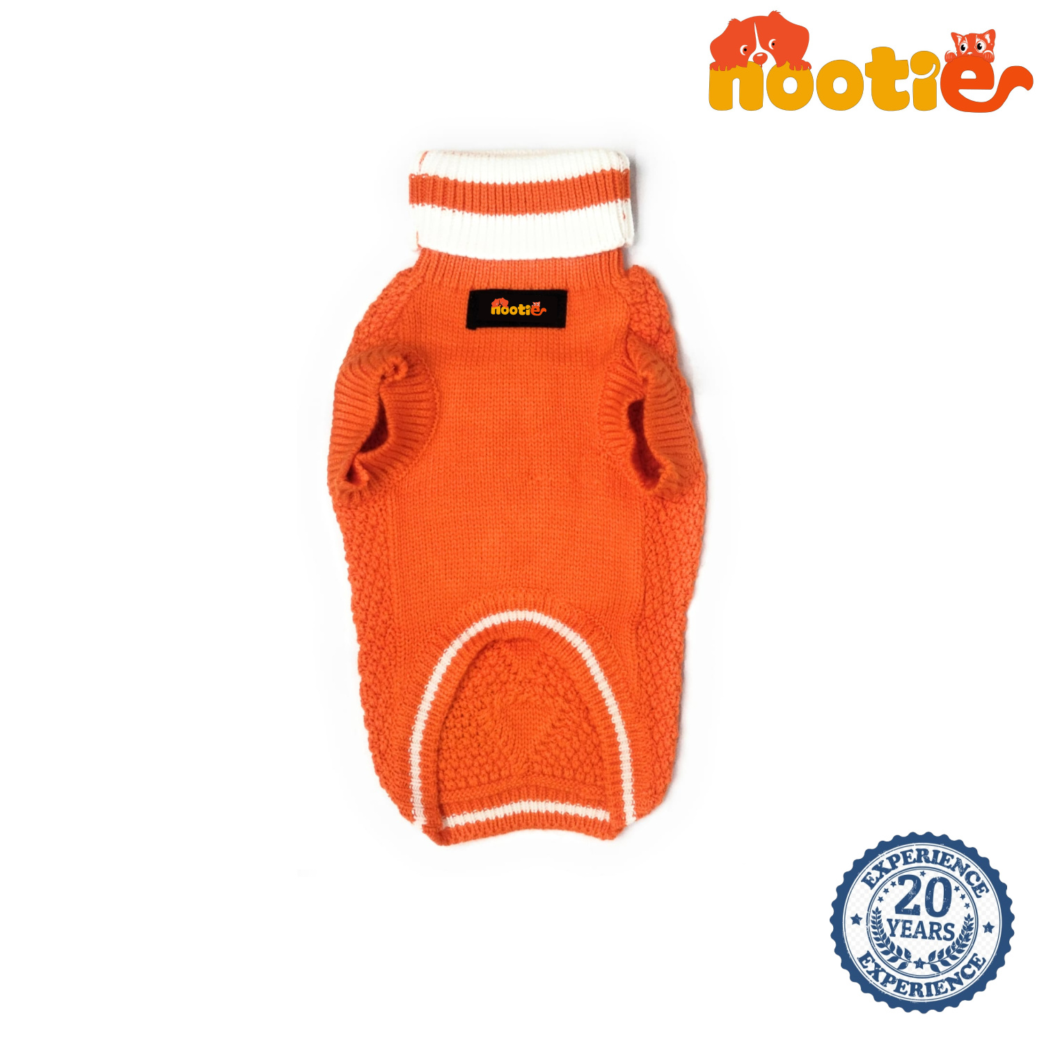 Nootie Dog High Neck Sweater, Orange – Soft, Warm & Lightweight Comfort. Made from premium, ultra-soft knit material, this sweater offers gentle warmth and a breathable fit. The ribbed high neck and hem provide a secure yet flexible hold, making dressing your pet easy and hassle-free. With its timeless orange cable-knit pattern and white stripe accents, it’s a must-have for your dog’s winter wardrobe.