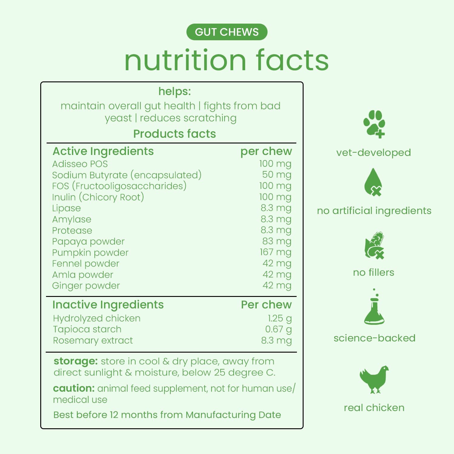 Active Probiotics (~15 Billion CFU per Chew) Bacillus coagulans, Bacillus subtilis, Bifidobacterium bifidum, Bifidobacterium animalis, Enterococcus faecalis, Lactobacillus acidophilus, L. casei, L. plantarum, L. paracasei, L. rhamnosus, L. reuteri, Saccharomyces cerevisiae, Streptococcus thermophilus Functional Additives Adisseo POS – 100 mg Sodium Butyrate (Encapsulated) – 50 mg FOS & Inulin – 200 mg Digestive Enzymes (Amylase, Lipase, Protease) Pumpkin, Papaya, Fennel, Ginger & Amla Powders Inactive Ingredients Hydrolyzed Chicken, Tapioca Starch, Rosemary Extract