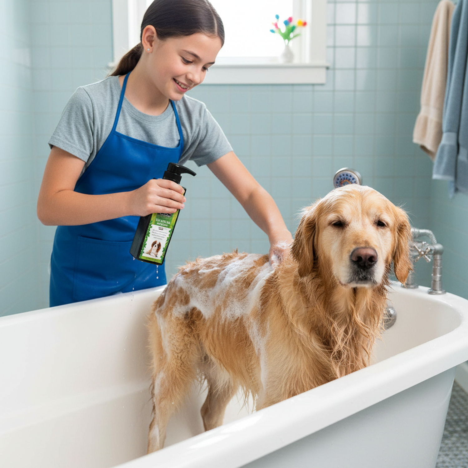 Wet coat thoroughly with lukewarm water. Apply shampoo evenly and gently massage until light foam forms. Leave for 2–3 minutes, rinse well, and towel dry. Follow with conditioner for added softness and shine. |
