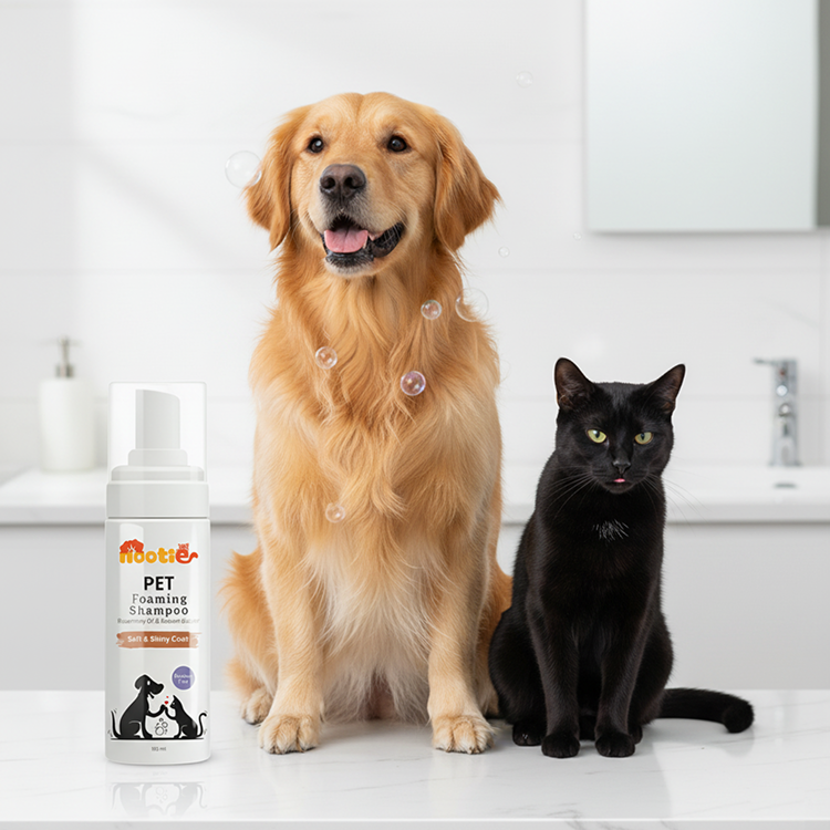 Nootie’s Pet Foaming Shampoo offers a mess-free, mild cleansing experience through its luxurious foam formulation. Infused with the natural conditioning power of Kokum Butter, it restores moisture, softness, and shine to dull coats. Rosemary Oil promotes healthy skin by improving blood circulation and preventing flakiness or dandruff. The no-tear, sulphate-free formula ensures a comfortable and irritation-free bath even for sensitive pets. Its rich lather removes dirt and odour effectively, while the light, calming fragrance leaves your pet feeling fresh for days. Ideal for frequent use and compatible with all fur types. Product Highlights ✅ Deeply nourishes coat with Kokum Butter for instant softness & shine ✅ Boosts skin vitality as Rosemary Oil improves circulation ✅ 100% chemical-free — no parabens, sulphates or harsh detergents ✅ Gentle, soothing formula perfect for sensitive skin ✅ Cleans effectively while preserving natural skin oils ✅ Provides natural hydration for a supple, healthy coat ✅ Leaves a light, long-lasting refreshing fragrance ✅ Easy, water-saving application with soft foaming pump