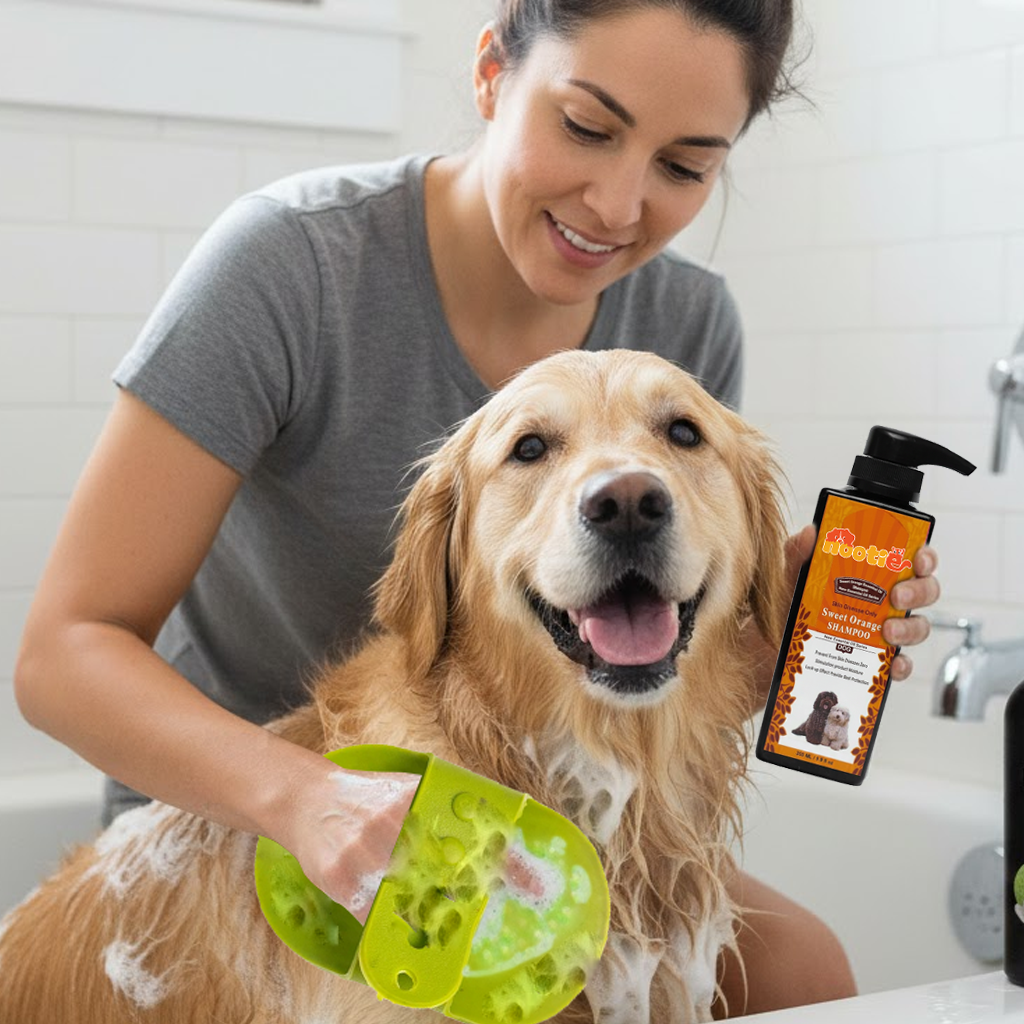 A soft, skin-friendly TRP rubber bath glove designed for daily grooming, bathing, and massaging dogs and cats. Removes loose hair, boosts coat health, improves blood circulation, and prevents shedding around the house. Adjustable ring-grip handle ensures a perfect fit for all hands. Safe for all breeds, all sizes, and all coat types.
