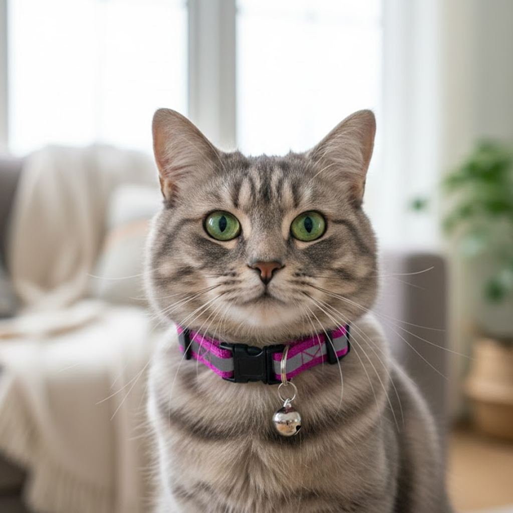 A durable and comfortable reflective safety collar designed for everyday wear, featuring a quick-release buckle, removable jingle bell, and ultra-bright reflective strip for nighttime visibility. Perfect for kittens and adult cats of all breeds (20–30 cm adjustable size).