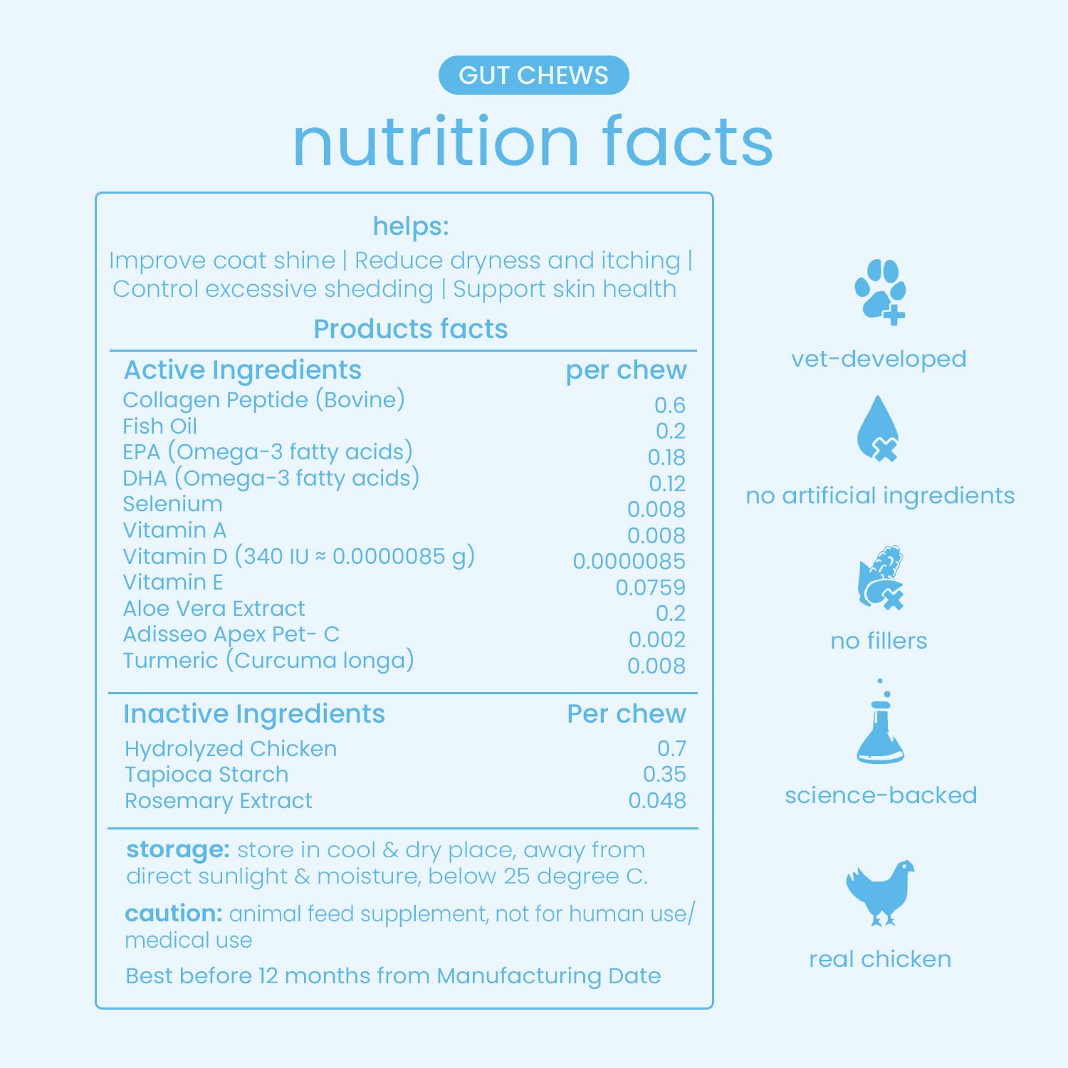 Vet-formulated daily skin and coat chews designed to hydrate skin, reduce itching, and minimise shedding in dogs. Powered by collagen peptide, fish oil, DHA & EPA (Omega-3), selenium, and vitamin A to support healthy skin barrier and a shiny coat.