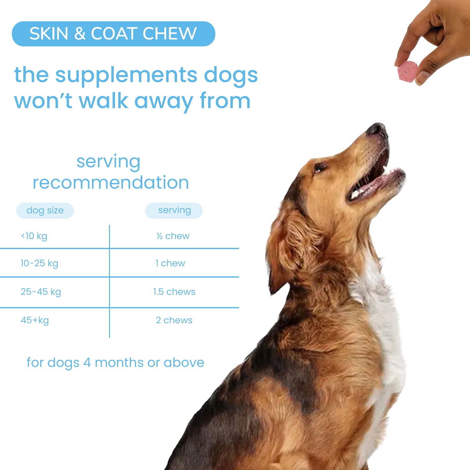 ✅ Hydrates skin from within with Omega fatty acids & Aloe Vera ✅ Reduces itching & irritation using EPA, DHA, Aloe Vera & Turmeric ✅ Controls excessive shedding with collagen peptides & Vitamin E ✅ Promotes a shiny, glossy coat with Vitamins A, D & E ✅ Strengthens the skin barrier & boosts immunity with antioxidants ✅ Supports overall skin health by improving elasticity & reducing redness ✅ Delicious daily chew that’s easy to feed & gentle on the stomach