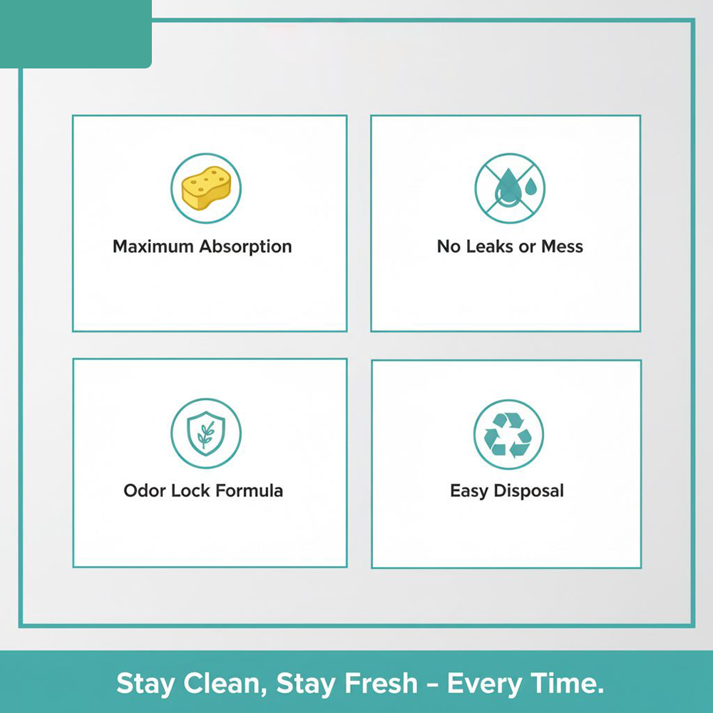 Premium 5-layer potty pads that instantly lock moisture, prevent leaks, and neutralise odours for a clean, hygienic home.