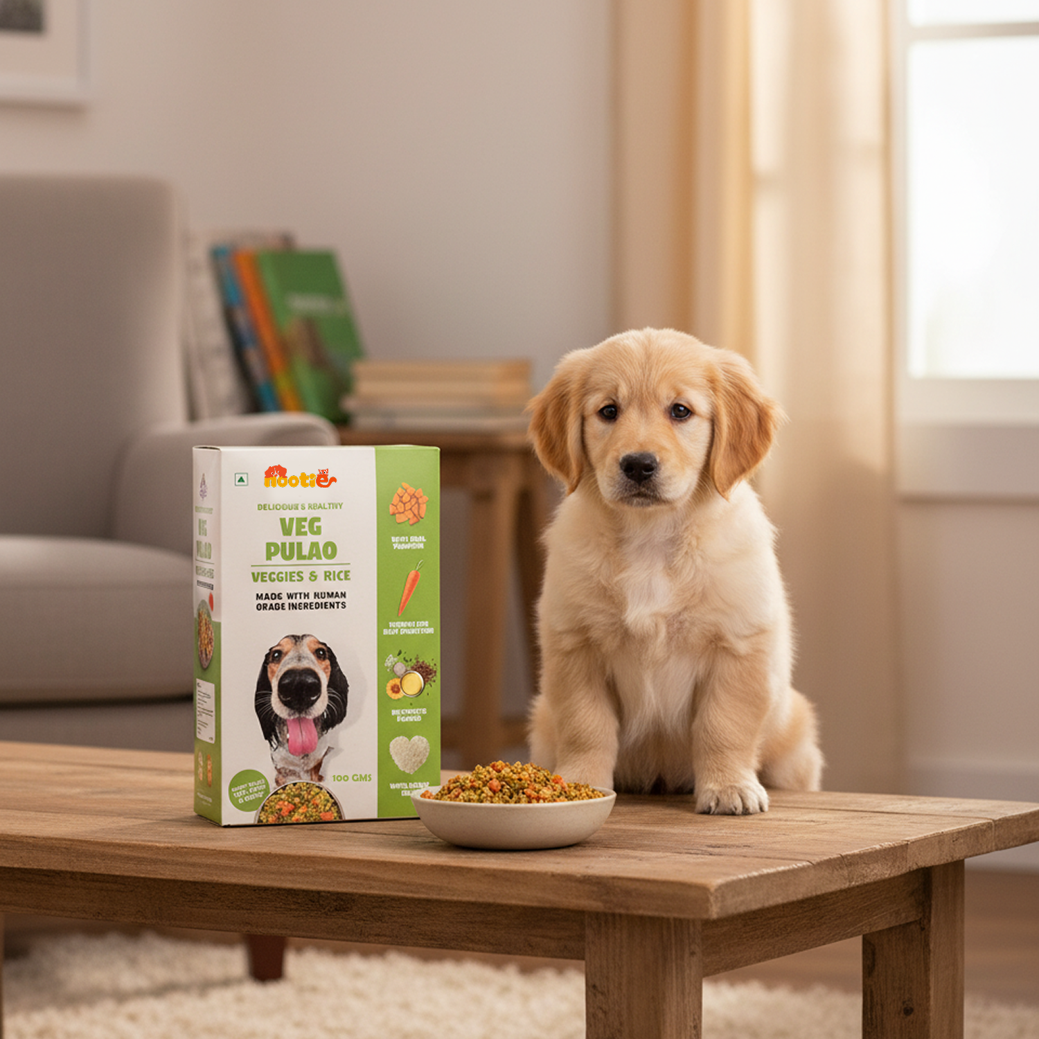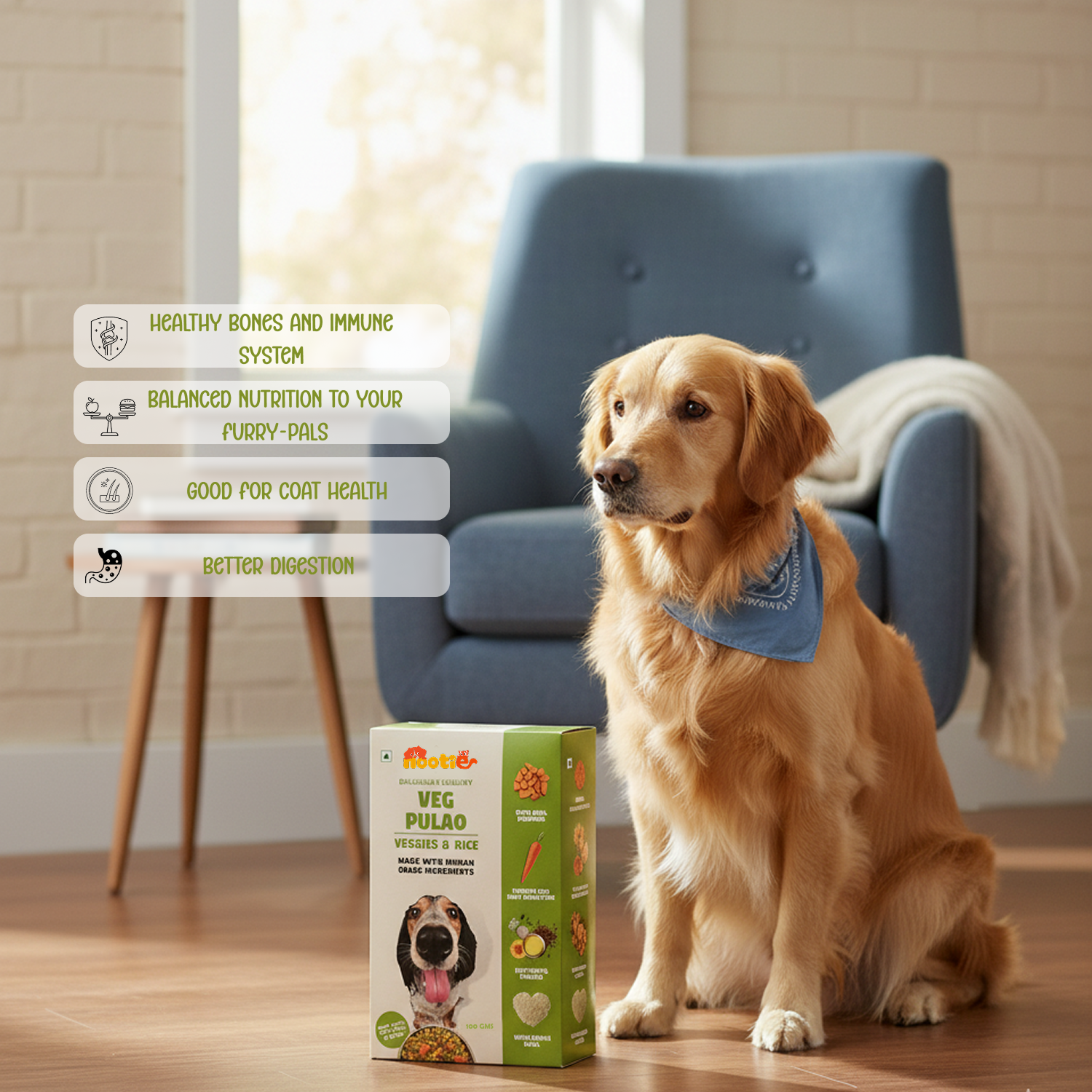 Wholesome, balanced meal for all-round health. ✅ Aids digestion with fiber-rich veggies & rice ✅ Nourishes skin & coat with omega fats ✅ Boosts immunity with vitamins & antioxidants ✅ Supports eye health with beta-carotene ✅ Provides steady energy & hydration ✅ 100% veg, gluten-free & preservative-free
