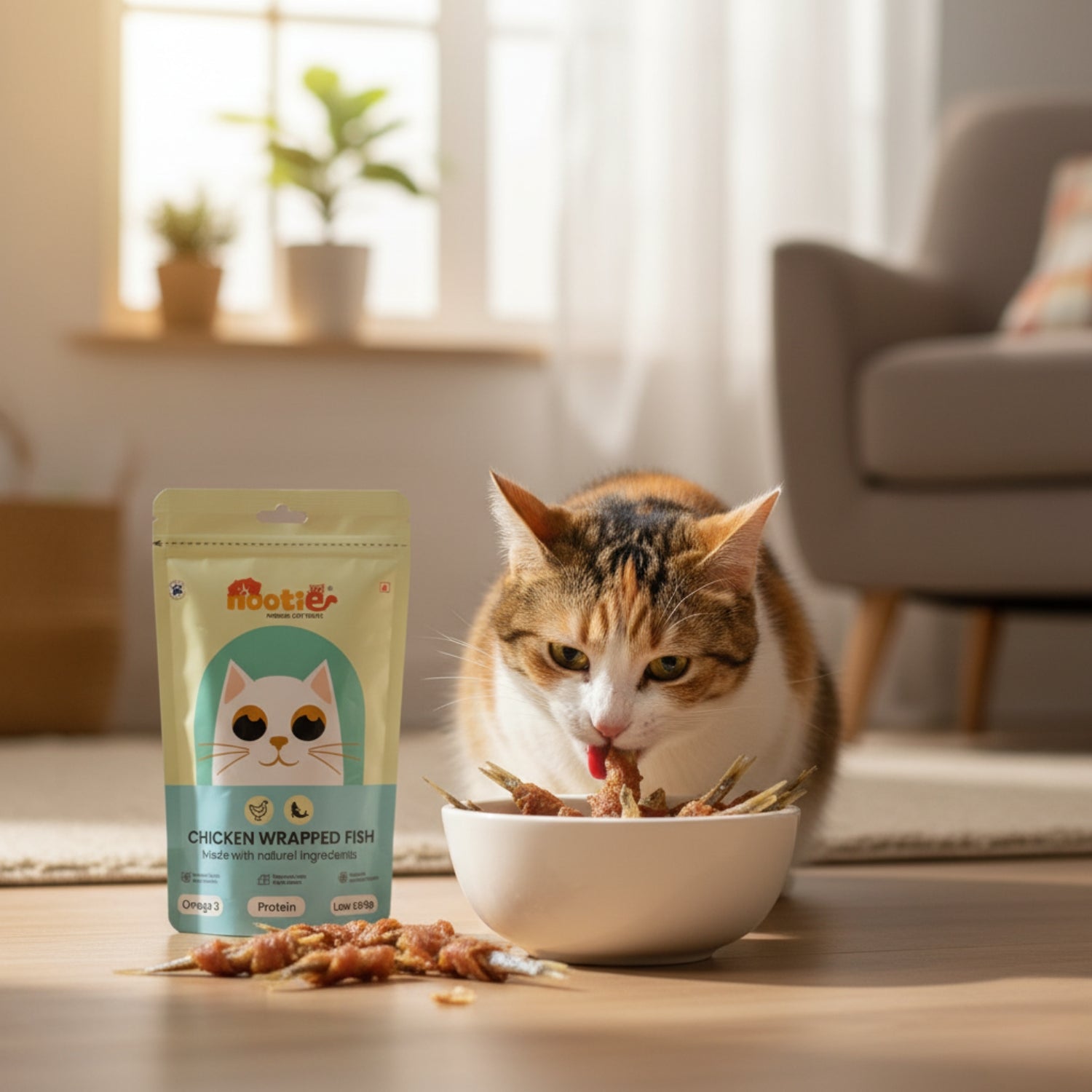 A premium, high-protein cat treat made with real chicken wrapped around fish, naturally rich in Omega-3. Crafted with low carbohydrates and clean ingredients to support immunity, digestion, and overall wellbeing. Perfect as a reward or daily treat for cats who love real meat flavors.